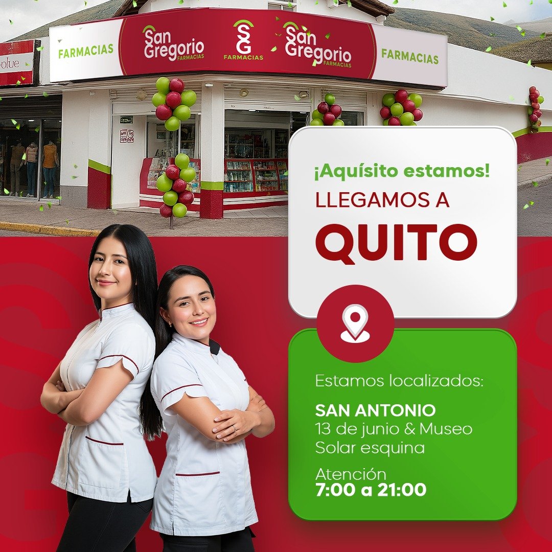 La capital ecuatoriana ya cuenta con la presencia de Farmacias San Gregorio en Quito, una cadena que arriba con fuerza y compromiso para brindar acceso cercano, seguro y confiable a medicamentos y productos de salud. Con la apertura de más de 17 puntos de venta, la ciudadanía aquiteña ahora dispone de una red sólida de farmacias distribuidas estratégicamente en diferentes sectores de la ciudad.